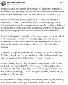اسلام آباد .اسلام آباد میں تعنات اسلامی جمہوریہ ایران کے سفیر رضا امیری مقدم نے اپنے x سابق ٹویٹر پر اپنے پیغام میں کہا ہے کہ ایک بار پھر قابلِ نفرت دشمن کی پروپیگنڈا مشینری متحرک ہو گئی ہے، جو اسلامی جمہوریہ ایران کے سپریم لیڈر کے بارے میں جعلی اور من گھڑت خبریں پھیلا رہی ہے اور بے بنیاد الزامات عائد کر رہی ہے۔ ان جھوٹے اور مضحکہ خیز دعوؤں کو دوٹوک انداز میں مسترد کرتے ہوئے کہا گیا ہے کہ یہ گمراہ کن مہم دشمن کی ناکامیوں پر پردہ ڈالنے کی ایک ناکام کوشش ہے—ایسی ناکامیاں جنہیں وہ میدانِ جنگ میں 12 روزہ جنگ کے دوران بہادر ایرانی فوجیوں اور کمانڈرز کے خلاف حاصل نہ کر سکا۔