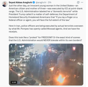 ایرانی وزیر خارجہ سید عباس نے اپنے x اکاؤنٹ سابق ٹویٹر پر ٹویٹ کر کے کہا ہے. ابھی چند دن قبل ہی امریکہ میں ایک دل دہلا دینے والا واقعہ پیش آیا، جہاں ایک معصوم نوجوان خاتون — جو امریکی شہری اور تین بچوں کی ماں تھی — کو امیگریشن اینڈ کسٹمز انفورسمنٹ (ICE) کے اہلکار نے قریب سے گولی مار کر ہلاک کر دیا۔ امریکی انتظامیہ نے اس خاتون کو بعد ازاں “گھریلو دہشت گرد” قرار دے دیا، جبکہ سابق صدر ڈونلڈ ٹرمپ نے اس واقعے کو خود دفاع کا معاملہ قرار دیا۔